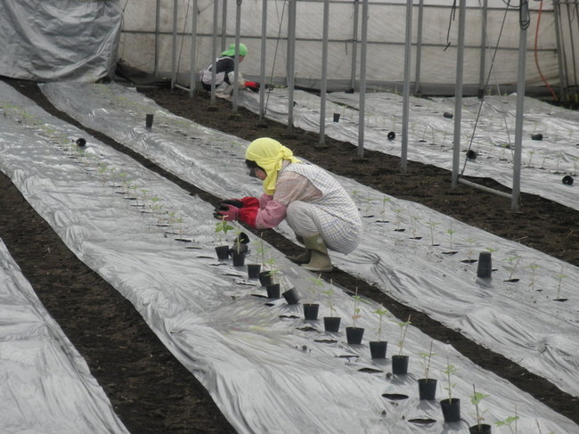 9月24日に本圃へ定植して、支柱へのテープ止めから糸つりまでを実施しました。今年は定植時期から台風が接近して台風対策に追われて一時期どうなるかと心配もしましたが、なんとかやり過ごしてきました。しかし、台風一過後の高温により定植した苗が焼けてしまい、活着が遅れていましたが最近やっと着花から着果へと先が見えてきたところです。